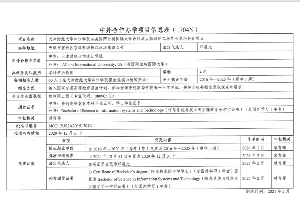 20158月,《教育部关于公布2015年上半年中外合作办学项目审批结果的通知》(教外【201557号)下发,我院与美国阿兰特国际大学(Alliant International University)合作举办物联网工程专业本科教育项目获得教育部批准。该项目纳入国家普通高等教育招生计划,于2016年招生。该项目为“3+1”模式,即前三年在本院学习,第四年赴阿兰特国际大学就读,毕业颁发中外双方学位。
