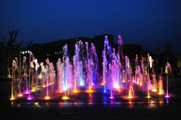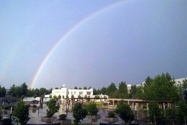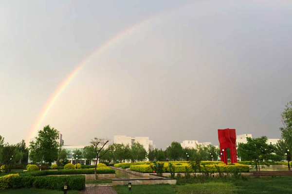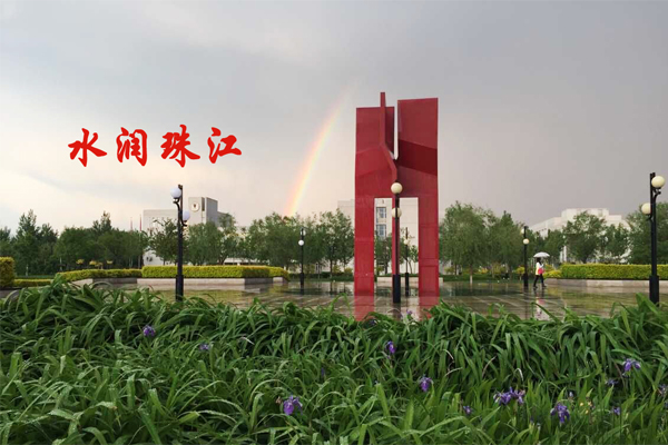 “千丈虹桥望入微,天光云影共楼飞。”雨后的傍晚,大地换上了清凉的外衣,花儿吮吸了充足的营养,重新绽开笑脸;草叶上汇聚的颗颗晶莹剔透的珍珠,反射着阳光,闪亮夺目。这时天空中架起了一座七彩的桥梁,为雨后的珠江园增加了美妙的气息,喷涌而出的泉水更增加了夜色的美。