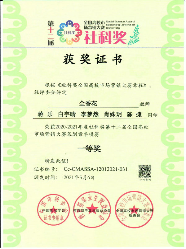 近年来,管理学院切实推进人才培养质量提升工作,按照新文科与国家一流专业建设要求,积极鼓励并组织学生参加各种创新创业与学科竞赛,以赛促学,以赛促教,持续强化学生专业技能与实践创新能力。社科奖全国高校市场营销大赛成绩的取得,进一步展示了管理学院教学和人才培养的成果与质量,对深化市场营销专业建设与教学改革、培养学生创新精神和实践能力起到了助推作用。