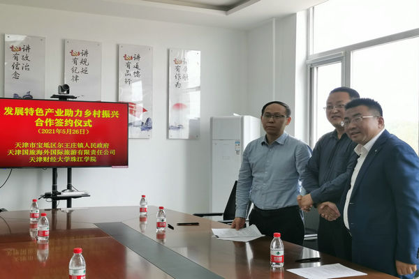 为扎实推进结对帮扶工作与乡村振兴有效衔接,发挥特色产业在促进乡村振兴中的积极作用,2021年5月26日下午,在宝坻区尔王庄镇政府,我院与天津市宝坻区尔王庄镇人民政府、天津国旅海外国际旅游有限责任公司签订了“发展特色产业助力乡村振兴战略实施合作框架协议”。