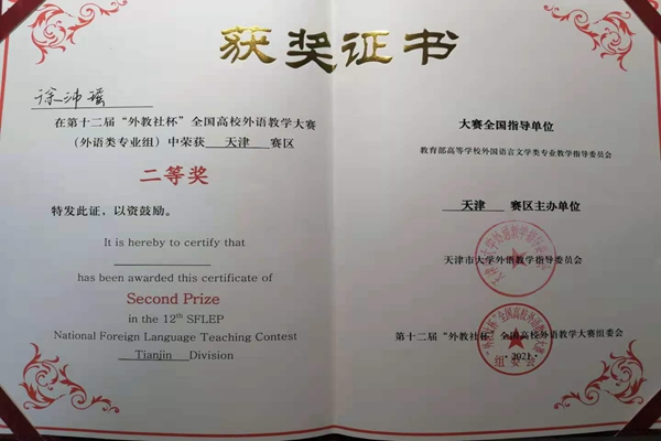 2021年6月6日,人文学院教师徐沛瑶获得第十二届“外教社杯”全国高校外语教学大赛天津赛区二等奖。