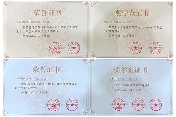 我院金融学1932班、数据工程1808班荣获天津市先进学生集体荣誉称号,林荣等13名学生荣获天津市优秀学生荣誉称号,李思雯等5名学生荣获天津市优秀学生干部荣誉称号,管理学院王迎悦同学荣获天津市大学生年度人物提名奖和王克昌奖学金,艺术学院兰欣玉同学荣获天津市大学生自强自立年度人物提名奖和2020年海河自强奖学金。