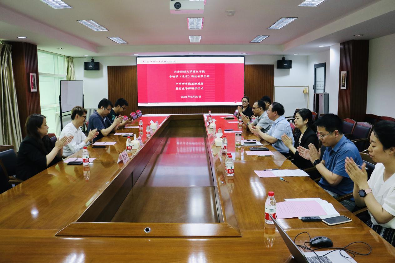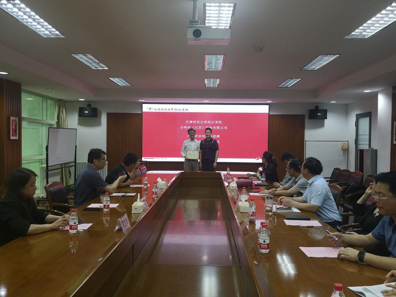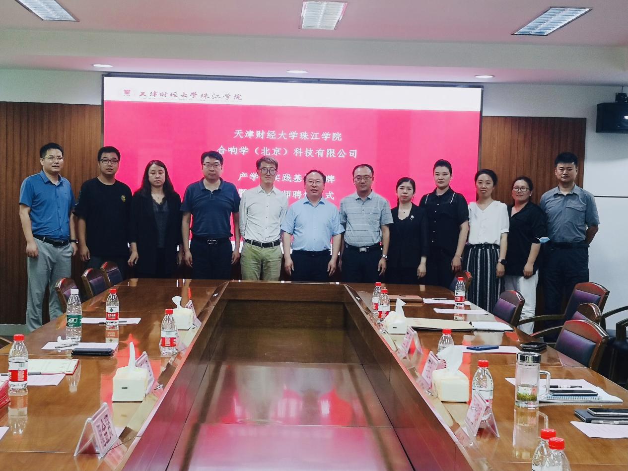 6月29日下午我院与合响学(北京)科技有限公司在弘毅楼举行产学研实践基地授牌暨行业导师聘任仪式。合响学(北京)科技有限公司联席总裁潘竑旭、中台经理隗金贤、高端课程总监张越、运营经理蒋昊,学院副院长李金山、党委副书记王猛、财务总监陈明明,学院人事部、培训部、学工部、财务部、教务部负责人及有关工作人员参加。