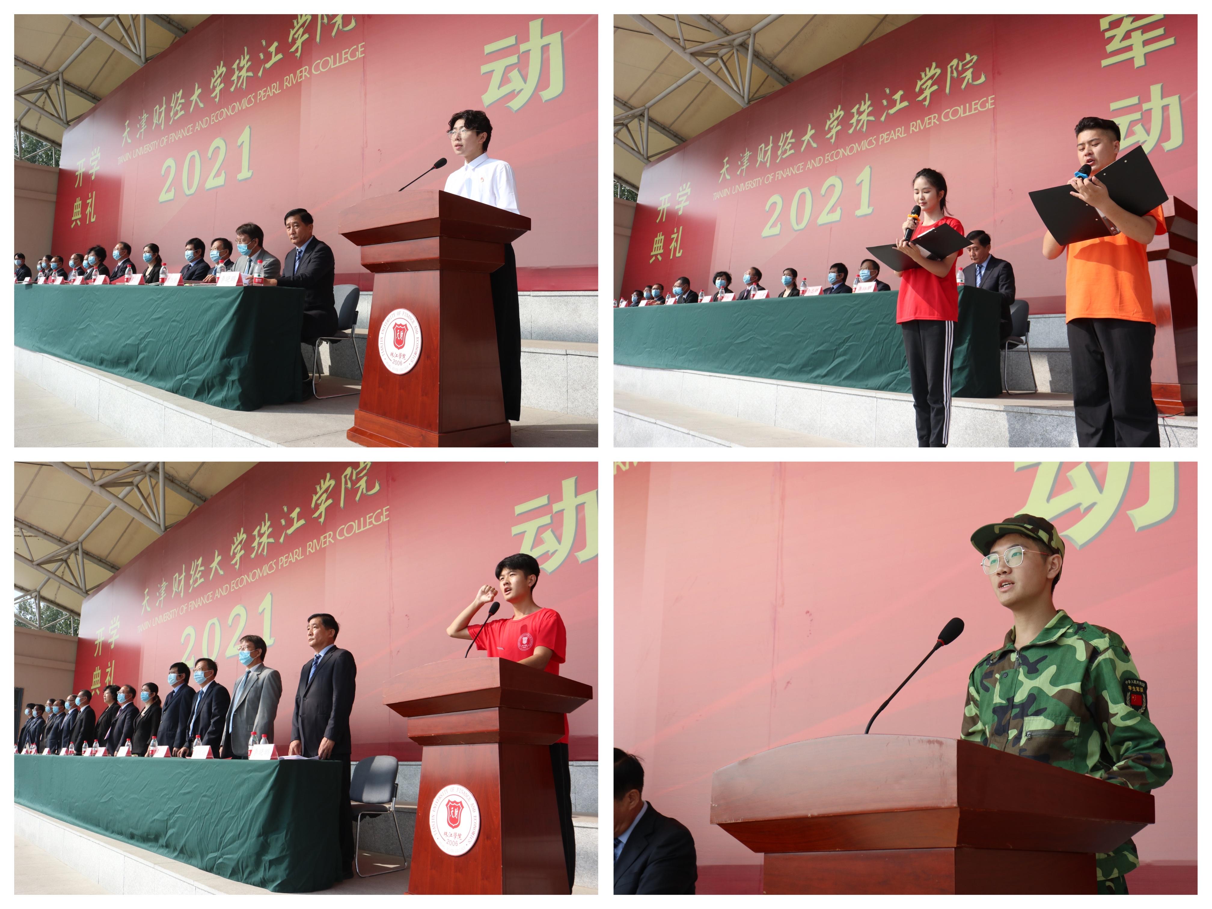 管理学院工商管理2101班宋怡然、艺术学院音乐学2103班谢宁代表新生发言,他们以一首慷慨激昂的诗朗诵展示了新一代珠江人的风貌。全体新生在管理学院注会2104班郭亚辉同学的带领下宣读誓词。