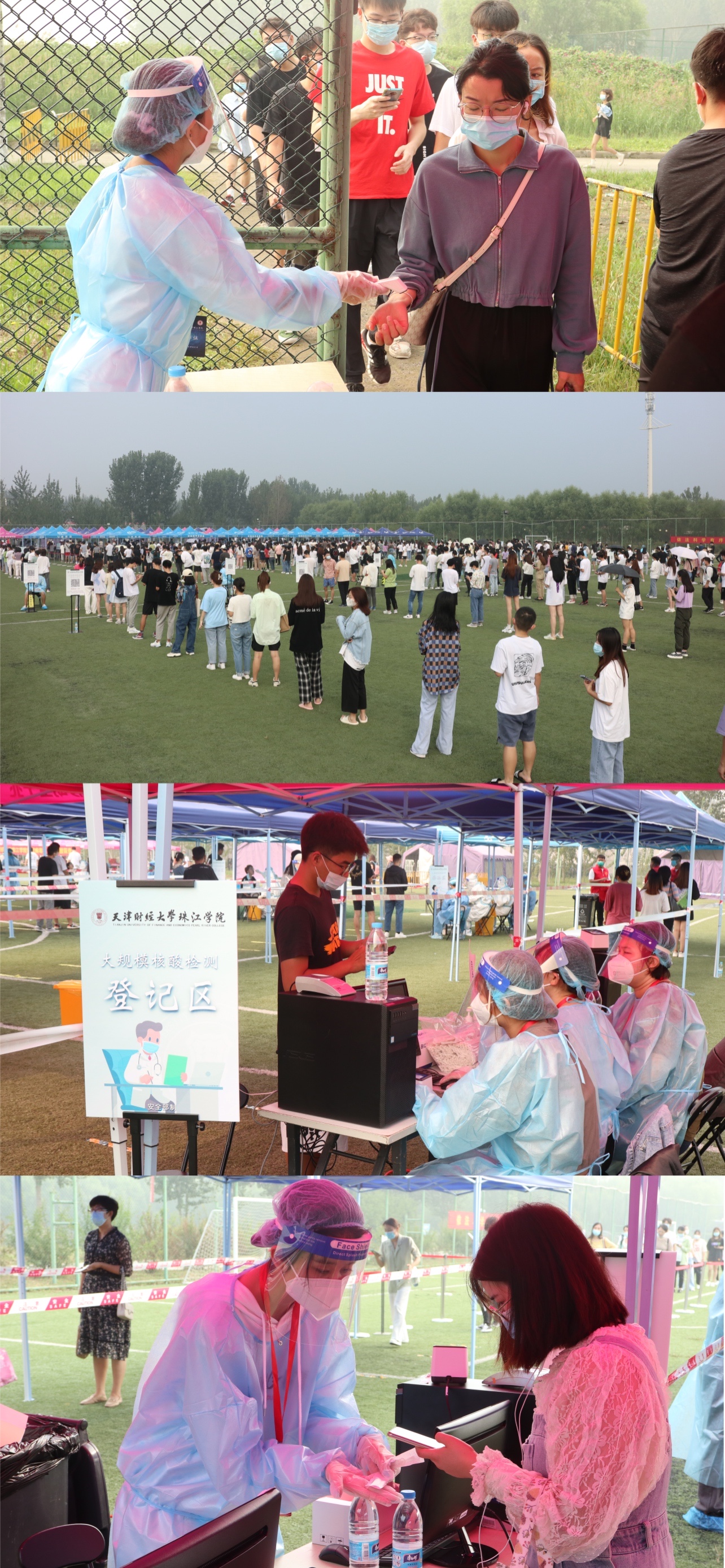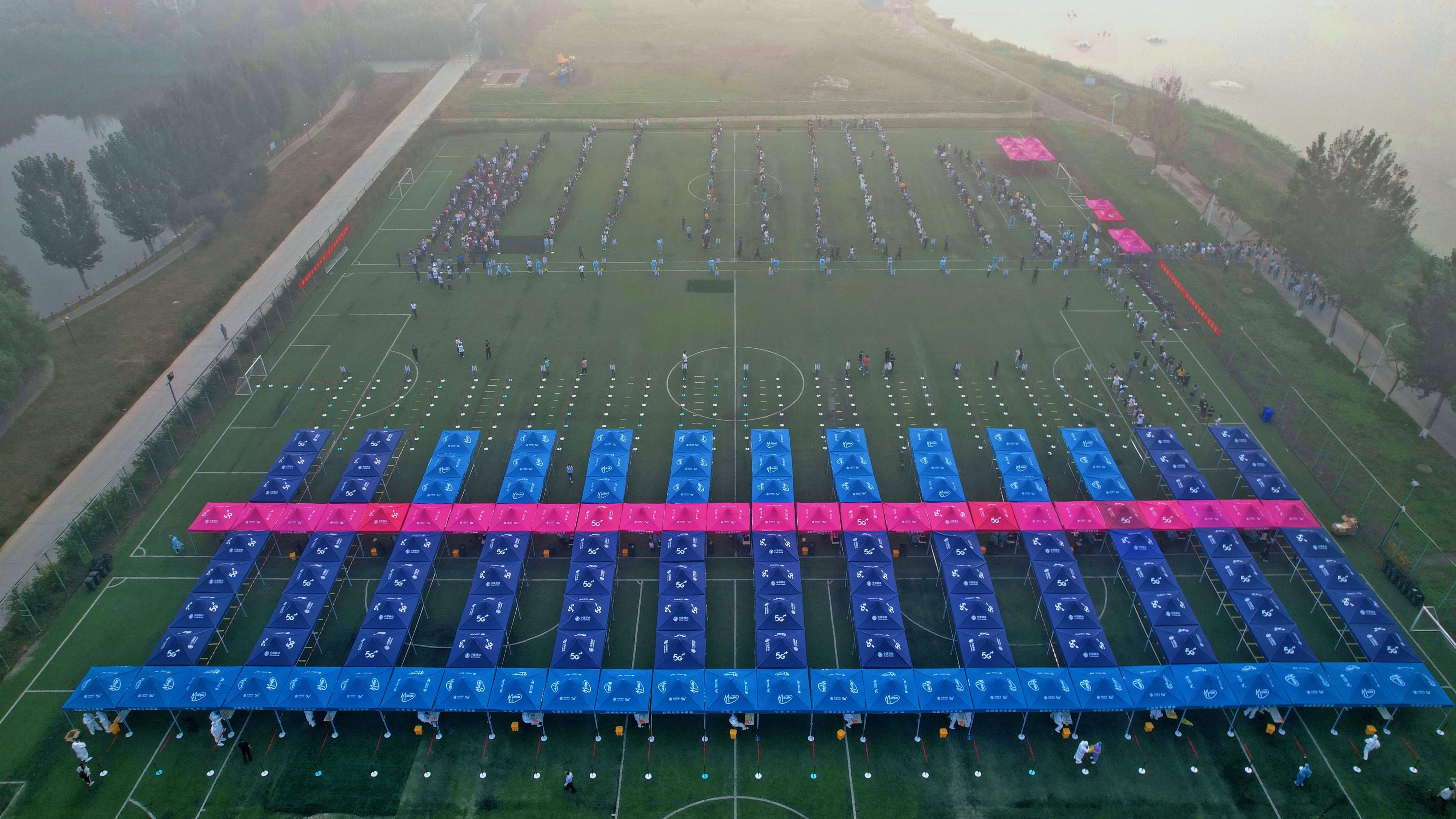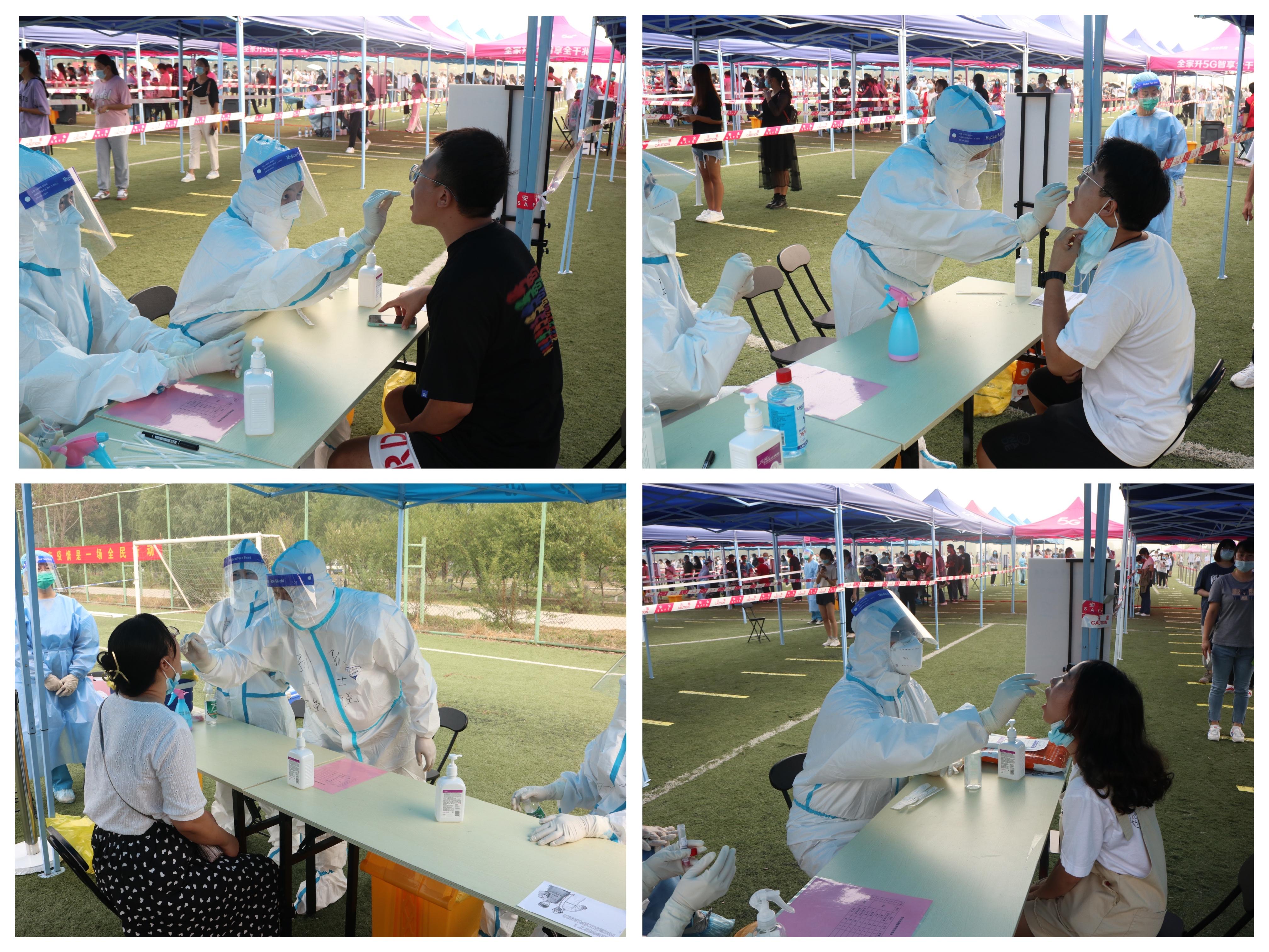 上午7时,检测工作正式开始。小足球场设立了13组登记采样通道,并提前设置好测温区、预备区、等候区、登记区、采样区、缓冲区、临时隔离区、紧急治疗区等区域,帐篷、桌椅、一米线、指引标识、水电等设置齐全。在工作人员及志愿者引导下,所有待检人员全程佩戴口罩,有序排队等候,积极主动配合核酸检测工作。