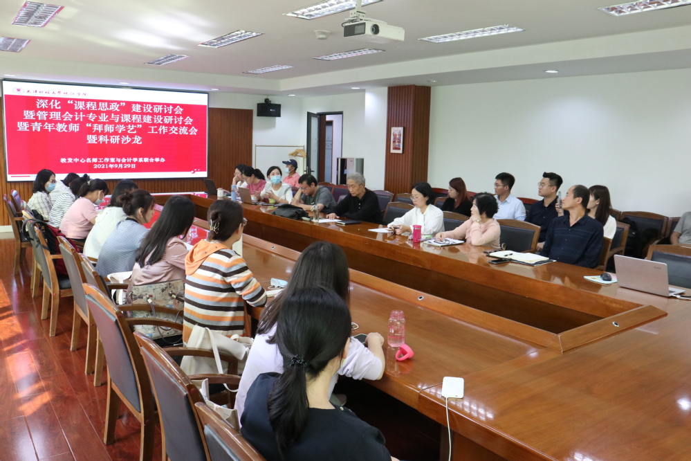 9月29日下午,教发中心名师工作室与会计学系联合举办“课程思政”建设研讨会、管理会计专业与课程序建设研讨会、“科研沙龙”、青年教师“拜师学艺”系列活动交流。会计学系全体教师、科研部部长张盘铭教授、学院培训部负责人胡晓玲、高顿教育天津分校校长张长睛及工作人员、名师工作室王志宇教授参加此次活动。