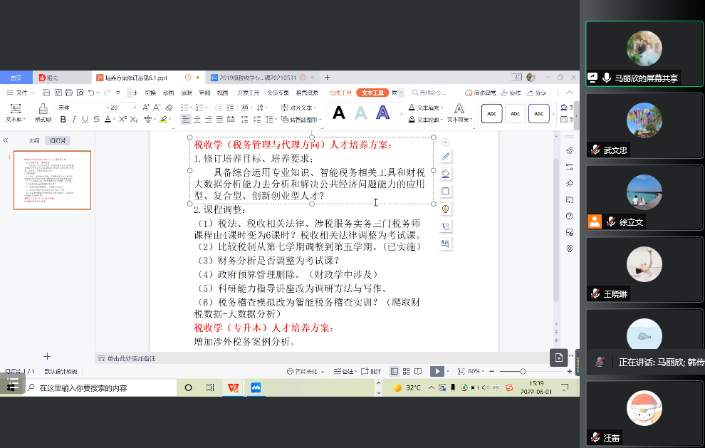 王志宇教授指出人才培养方案是教学工作的顶层设计,专业设置应以市场需求为导向,实践课程需体现“劳动+”元素;汪蕾老师提出财务管理专业应补充大数据、智能财务等信息,课时不变,升级3门课程,例如将“会计信息系统”升级为“智能会计信息系统”;汤小芳老师结合审计学专业市场人才需求及课程特点,建议将内部控制学课程从专业方向课调至专业核心课,指出升级3门课程,增加数智方面知识;马丽欣老师说明税收学专业培养目标和培养方案的修订方向,提出增加中国税制、税收相关法律、涉税服务实务3门课程的课时,将税收相关法律调整为考试课。