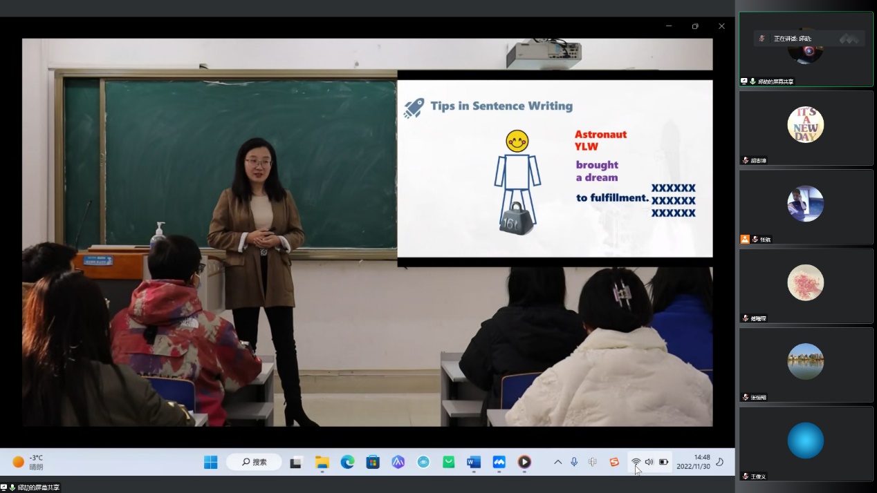 11月30号下午,张航名师工作室通过线上形式举办大学英语教学比赛示范课活动。人文学院院长杨颖教授莅临指导,公共英语教学部主任、名师工作室负责人张航教授主持,名师工作室全体成员及部分公共英语教学部教师参加了此次活动。