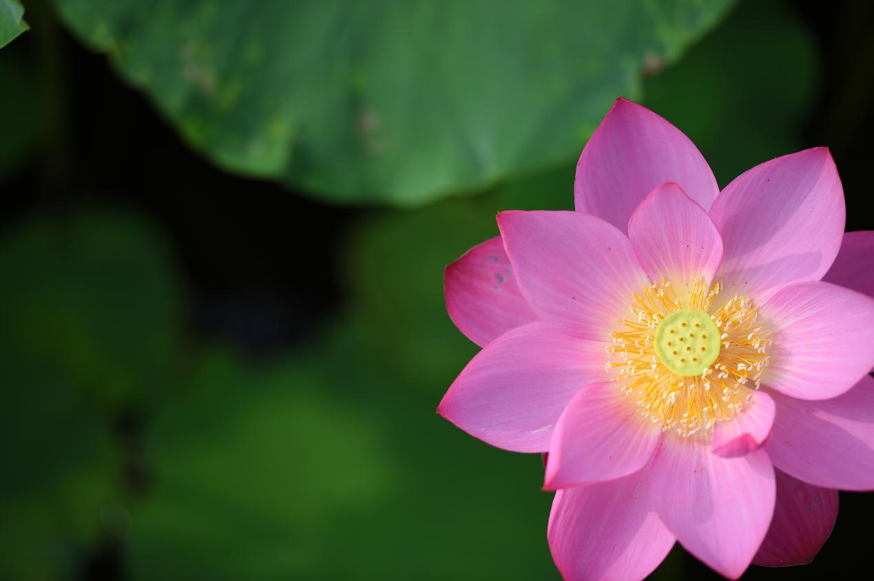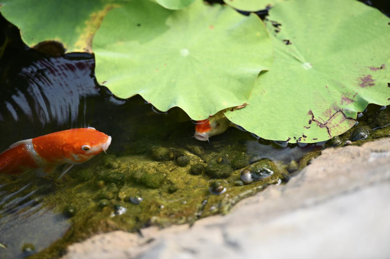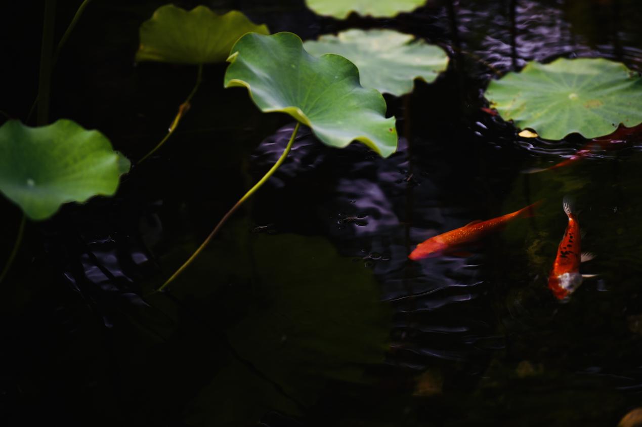 碧水池莲映荷塘,小伞底下锦鲤藏。