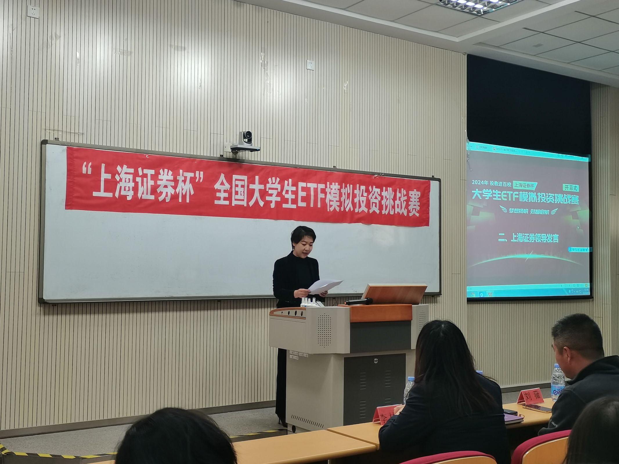 4月10日下午,王丽娜名师工作室在日新110举办“上海证券杯”全国大学生ETF模拟投资挑战赛开幕式。上海证券天津分公司总经理刘薇、副总经理葛博威总监范维涛和合规总监托丹丹应邀参会。本次会议由孟颖副教授主持,经济学院师生共100余人参加。
