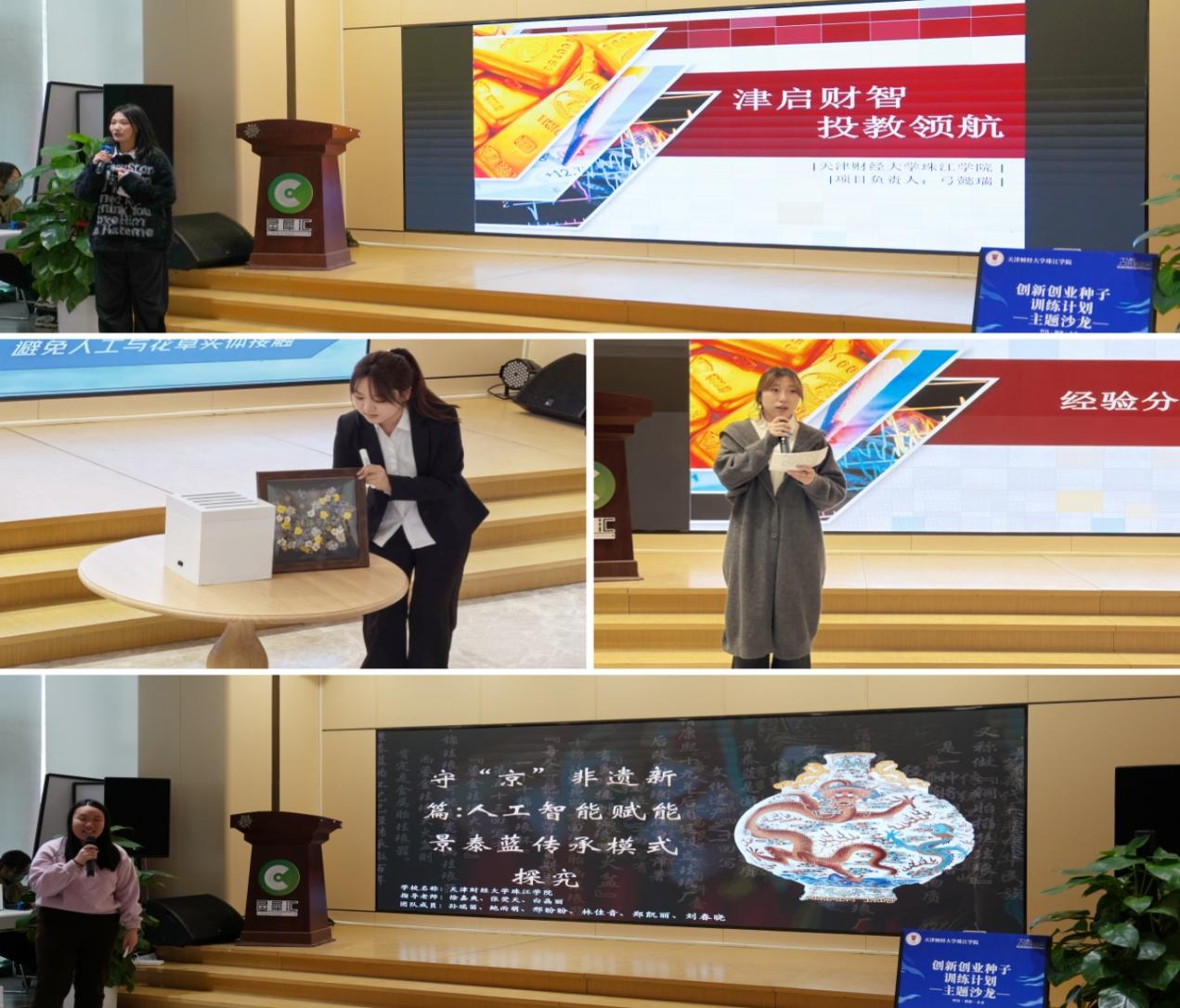 本次活动专门面向大一新生设置,旨在通过“项目分享+互动问答+实景研学”的多元形式,为青年学子搭建实战交流平台,助力创新种子生根发芽。共有三个优秀创新创业团队受邀在沙龙活动中进行经验分享。“津启财智”项目负责人立足金融专业视角,将科技金融与数字金融的核心逻辑拆解为易懂的投资语言;“景泰蓝传承模式探究”以人工智能赋能非遗技艺,首创双非遗融合路径;“便携电子压花器”3D 打印轻量化外壳,内部集成微型烘干与主动通风系统,显著提升压花效率。随后进行了互动交流环节,新生纷纷就自己关心的创新创业问题进行交流。学生工作部创业指导中心主任邵阳,行知众创空间指导老师孙怡和项目团队负责人针对新生提出的“创业项目选题方向”“校园创业资源获取”“专业与创业如何结合”等核心问题,结合自身教学经验与行业案例,进行细致解答,为新生梳理创新创业入门思路,消除实践顾虑。最后,学子们在天开园众创空间讲解老师的带领下实地探访了天开高教科创园,与部分创业团队进行互动交流,近距离触摸前沿科技发展脉搏,感受园区浓厚的创新生态氛围。
