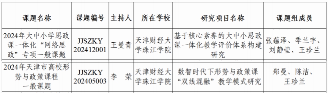 天津市教委公布2024年度天津市思想政治理论课常设课题结项名单,王曼青教授主持的2024年大中小学思政课一体化“网络思政”专项一般课题《基于核心素养的大中小思政一体化教学评价体系构建研究》和李荣老师主持的2024年天津市高校形势与政策课程一般课题《数智时代下形势与政策课“双线混融”教学模式研究》均顺利通过结项验收。