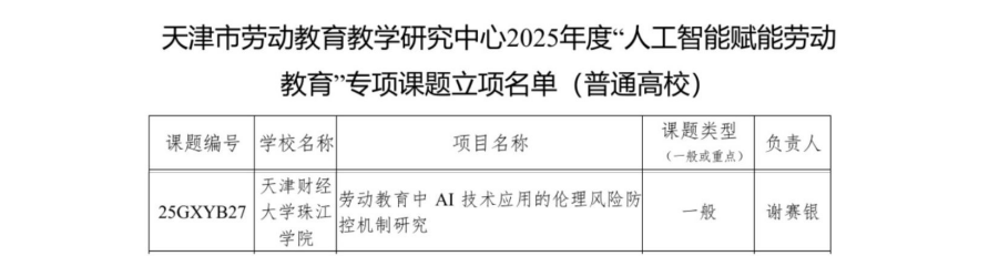 近日,天津市劳动教育教学研究中心正式公布2025年度专项课题立项结果,马克思主义学院副院长谢赛银教授申报的《劳动教育中AI技术应用的伦理风险防控机制研究》课题成功立项。
