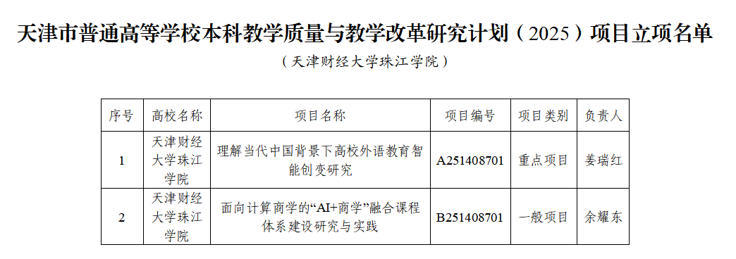 近日,天津市普通高等学校本科教学质量与教学改革研究计划(2025)项目立项评审结果正式公布。学院2个项目成功获批立项。青年教师姜瑞红主持申报的课题《理解当代中国背景下高校外语教育智能创变研究》获批重点项目立项,这是学院首次获批省部级教改研究重点项目。余耀东老师主持申报的课题《面向计算商学的“AI+商学”融合课程体系建设研究与实践》获批一般项目立项。