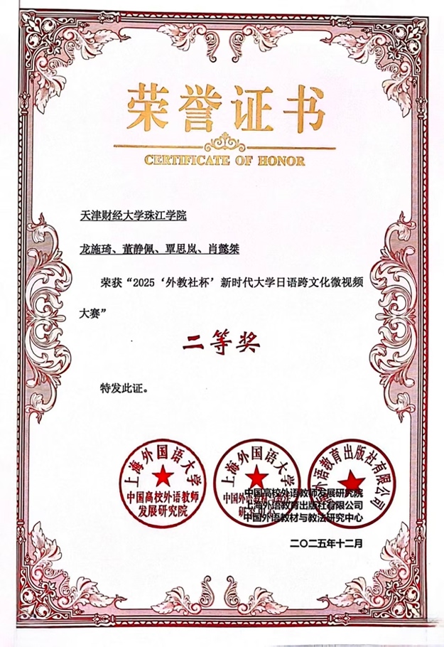 近日,2025“外教社杯”新时代大学日语跨文化微视频大赛获奖名单公布,由人文学院日语2201班龙施琦、董静佩、覃思岚、肖懿桀四位同学组成的团队荣获全国二等奖,指导教师郭洁老师荣获“指导教师二等奖”。