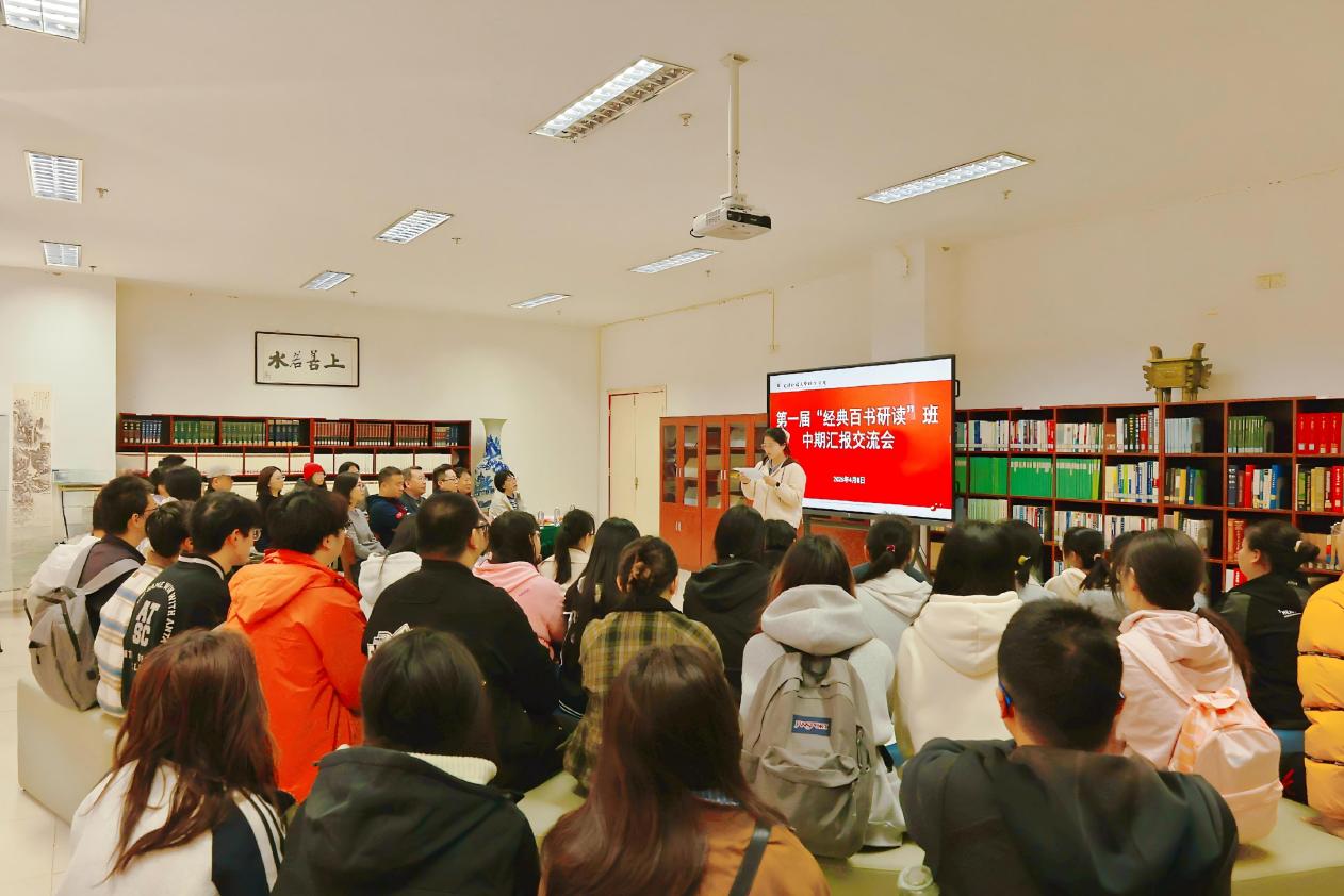为全面总结“经典百书研读”活动的阶段性成效,4月8日,第一届“经典百书研读”班中期成果交流会在图书馆文华苑顺利举行。各研读小组的专业指导教师、图书馆相关负责人及研读班全体学员共同参加,分享感悟、交流经验。