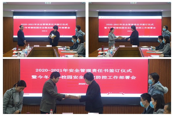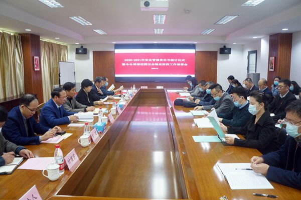 为做好今冬明春校园安全稳定防控工作,落实安全责任制,12月10日上午,我院在弘毅楼综合培训室召开2020-2021年度安全管理责任书签订仪式暨今冬明春校园安全稳定防控工作部署会。学院领导班子、各二级学院并部级单位负责人参加了会议。会议由安全部部长赵伟主持。