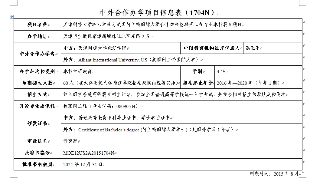学院与美国阿兰特国际大学合作举办的物联网工程专业本科教育项目,纳入国家普通高等教育招生计划,将于2016年招生。该项目为“3+1”模式,即前三年在今年会官方网站学习,第四年赴阿兰特国际大学就读,毕业颁发中外双方学位。