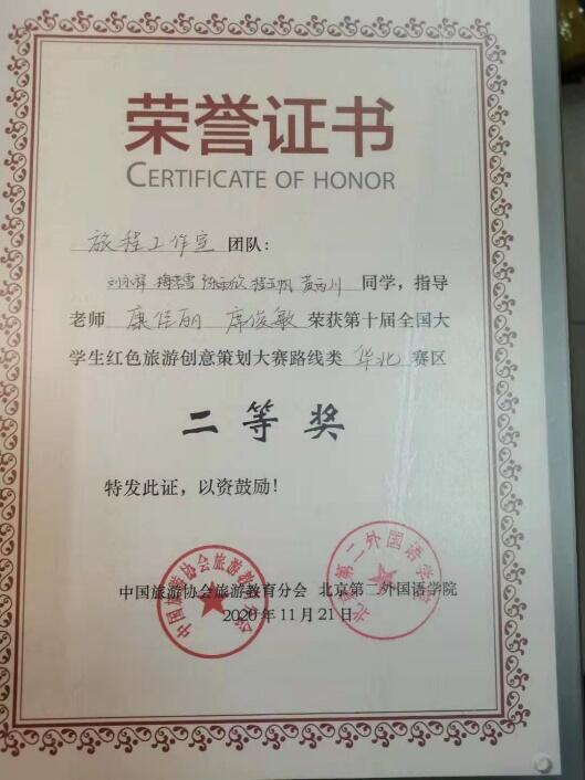 年9月,酒店与旅游管理系学生刘永祥和吴小雨带领的两支队伍参加第十届全国大学生红色旅游创意策划大赛获得路线类华北赛区“二等奖”和生态营销类华北赛区“二等奖”。