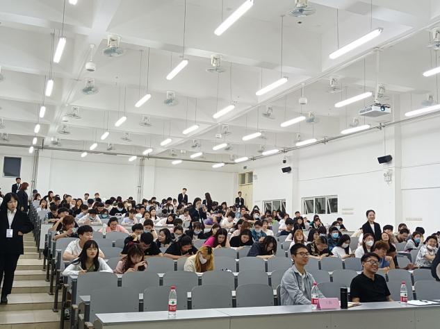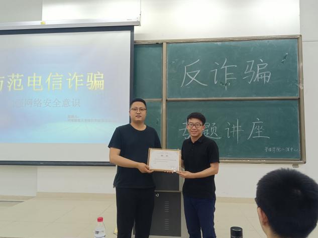 讲座第一项,为提高同学们的反诈意识,学院聘请赵伟老师为管理学院安全宣讲特聘讲师,由陈绍生副主任为学校安全部部长赵伟老师颁发聘书。在场人员庄重肃穆,目视颁发聘书仪式的进行。