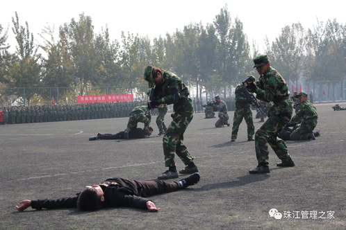 军体拳方队:军体拳是由拳打、脚踢、摔打、夺刀,夺枪等格斗动作组合而成的一种拳术,他们步伐矫健,目光凌厉,斗志昂扬,充分彰显了珠江学子能打胜仗、作风优良的坚定信念和坚强实力。