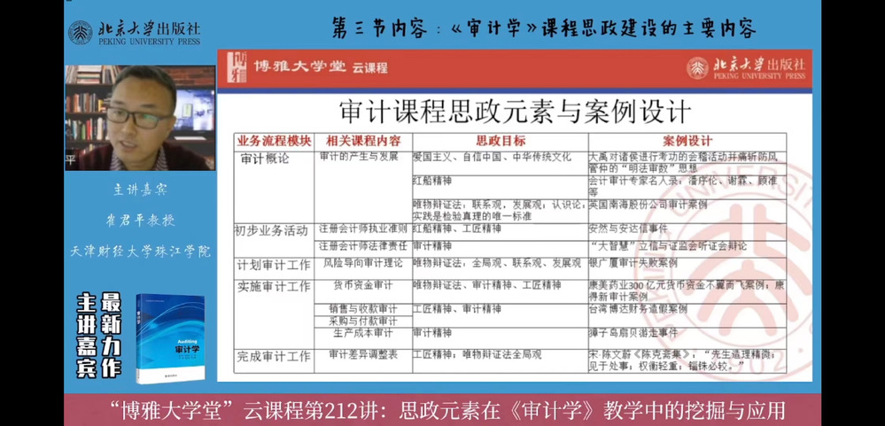 6月8日,会计学系崔君平教授主讲的“思政元素在《审计学》教学中的挖掘与应用”讲座在中宣部“学习强国”平台成功发布。该讲座是北大博雅大学堂云课程战“疫”系列公益讲座,与来自全国相关高校6.9万余名师生一起分享了《审计学》课程思政建设的重要性、思政目标设定思路、主要建设内容、思政元素挖掘、实施途径及教学案例分析等内容。这次入选“学习强国”,是会计学系既重视师德师风建设、又注重课程思政建设取得的成果,进一步提升了我院的知名度和美誉度。
