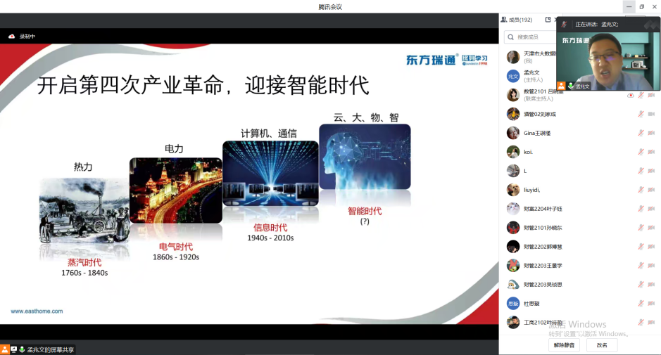 5月31日下午,管理学院邀请天津市东方瑞通教育培训学校有限公司系统信息工程师孟兆文老师,为学院学生开展数智人才培养系列讲座之“大数据时代下数据可视化分析”专题讲座,讲座采用线上形式,由管理学院教学办主任田雅娟老师主持。