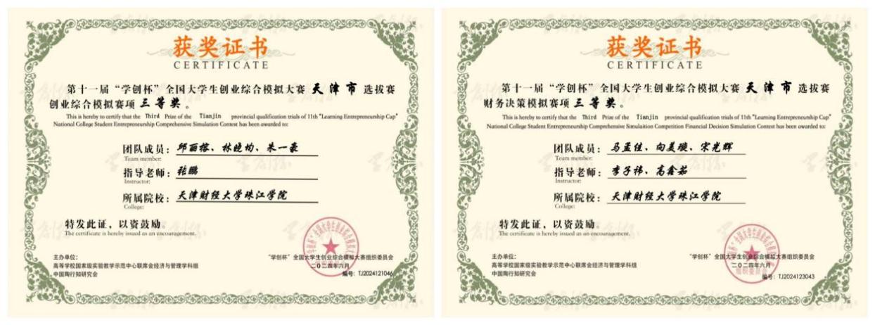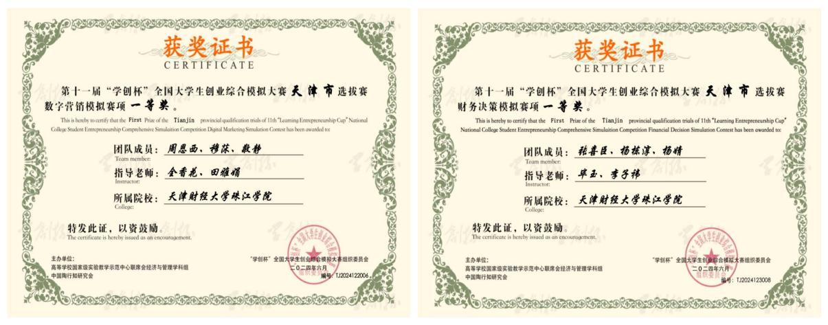 近日,第十一届“学创杯”全国大学生创业综合模拟大赛天津市选拔赛圆满落幕。学院13支参赛队伍在大赛中的数字营销模拟赛项、创业综合模拟赛项以及财务决策模拟赛项三条赛道中喜获佳绩,其中2支队伍获市级一等奖、9支队伍获市级二等奖、2支队伍获市级三等奖,均获得参加全国半决赛的资格。