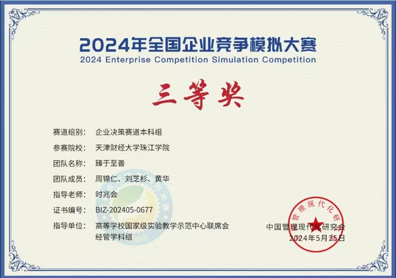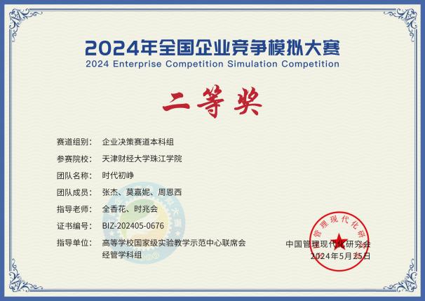 近日,2024年全国企业竞争模拟大赛圆满落幕。珠江学院两支参赛队伍在企业决策赛道全国总决赛中荣获二等奖、三等奖各1项,获奖团队如下:
