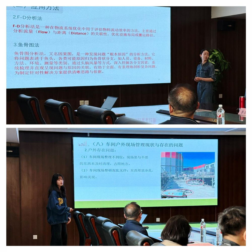 本次研讨会分为两个环节,第一环节为新时代管理学院应用型人才培养助力方家庄镇产业振兴成果汇报,汇报的成果是天津市一流课程建设项目《运营管理》课程的实践环节,该课程以师生课题组的形式,利用课下时间,历经5个月,以天津市泽宝水泥制品有限公司实习基地为调研对象,运用《运营管理》课程所学的理论与方法为该公司的生产布局与现场管理优化提供建议方案。汇报中,同学们针对公司总布局及车间现场管理中存在的问题,运用精益思想、SLP方法、布局优化及6S现场管理等理论提出了改进方案,旨在企业充分利用现有资源的条件下,大幅减少物料运输距离与物流强度,契合“双碳”目标,助力企业降低碳排放,从而实现降本增效,提高工作效率和改善工作环境。