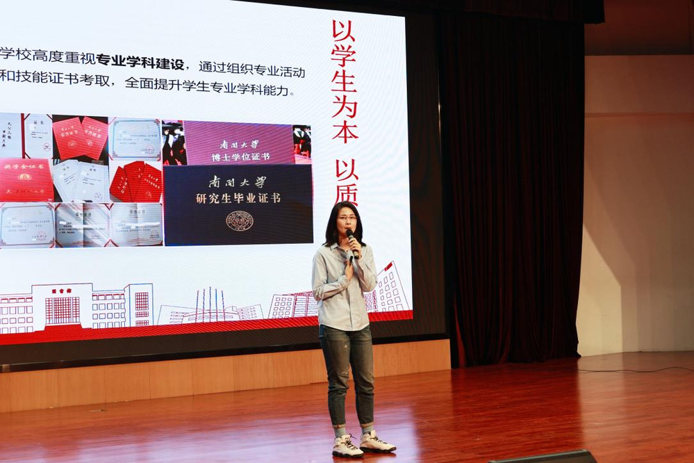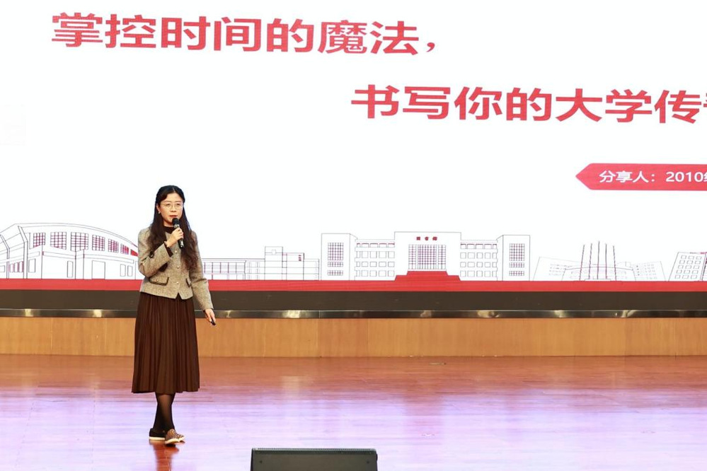 2010级人力资源管理专业校友徐丹妮。围绕“时间管理”展开分享。她结合自身出版畅销书、学习四门外语、创办公司的经历,向新生们分享了“时间管理三步法”。并鼓励同学们利用大学“时间银行”,通过考取有用证书、参与实践活动,为未来积累复利。