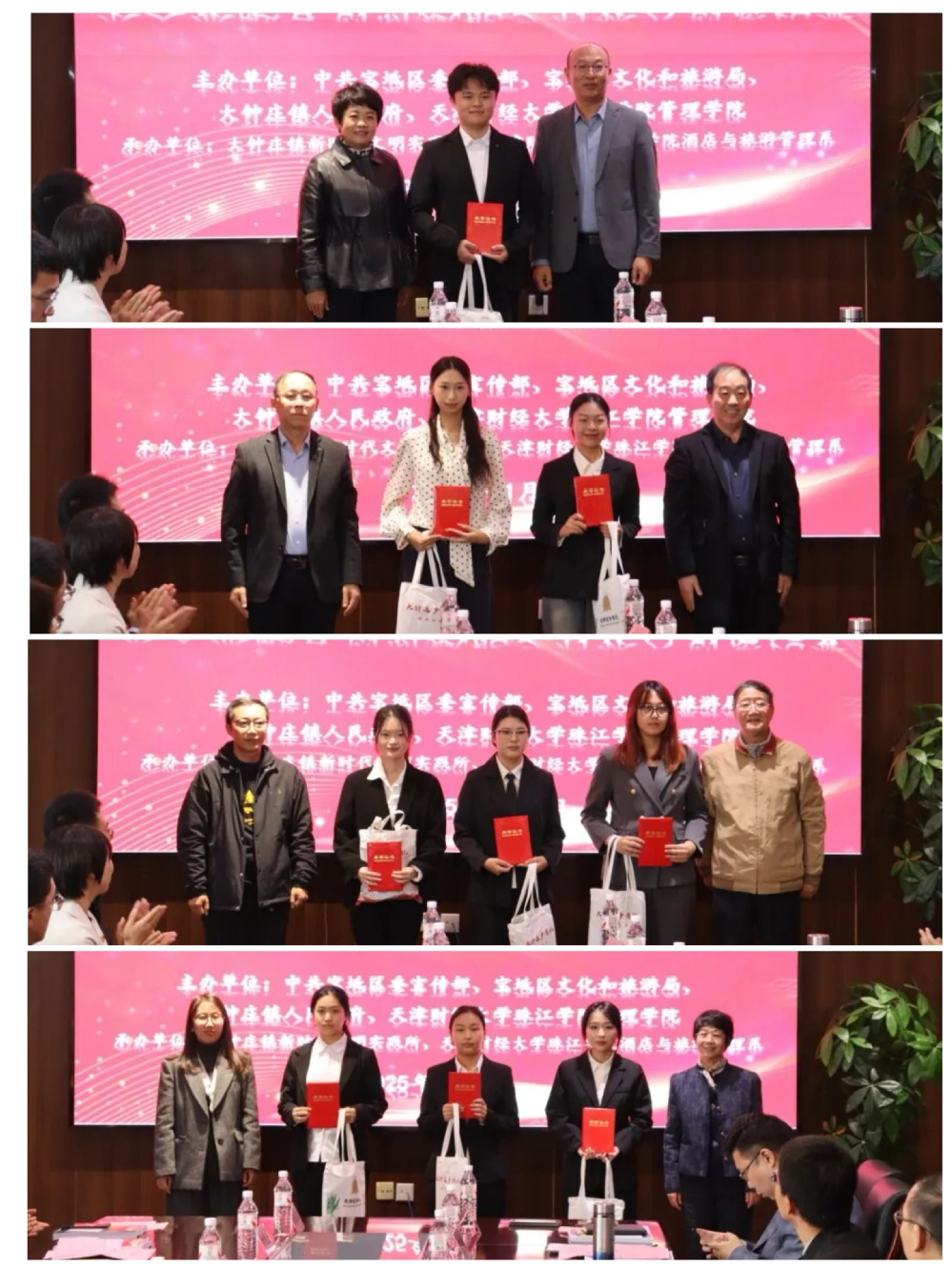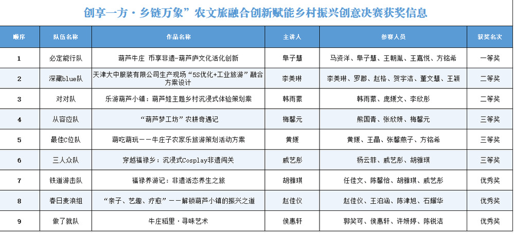 会议分为两个环节,第一环节为创意比拼,本次乡村振兴创意比赛决赛共有9支队伍脱颖而出,各参赛团队一年来,多次深入大钟庄镇、牛庄子以及大中服装有限公司开展调研,围绕大钟庄镇牛庄子村“葫芦小镇”核心资源,结合国家级非遗葫芦制作技艺、农耕生态、民俗文化等特色,设计了一系列兼具创新性、可行性与商业价值的农文旅融合方案。选手们依次展示了“乐游葫芦小镇”沉浸式体验策划、“葫芦连接城乡”农耕奇遇项目、“福禄养游记”非遗康养之旅等精彩方案。方案涵盖非遗活化、亲子互动、研学教育、康养休闲、夜间经济等多个维度,通过AR技术赋能、专属货币体系、角色扮演闯关、全产业链运营等创新形式,将静态的文化资源转化为动态的旅游体验,实现了从单一观光向多元融合的转型探索。经过激烈角逐,评委现场打分,最终评选出一等奖1组,二等奖2组,三等奖3组,优秀奖3组。与会领导分别为获奖学生颁发了证书与奖品。