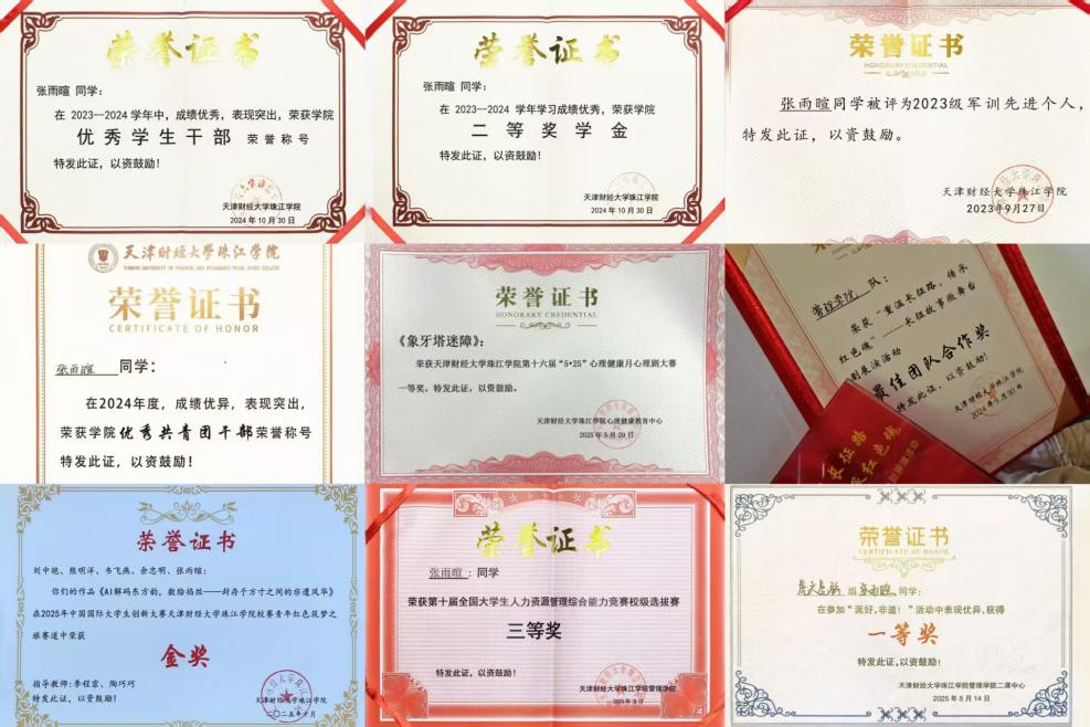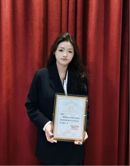 在学习上,张雨暄同学始终坚信“负笈求学,探索未知”的意义。立足自己的专业,刻苦学习,广泛涉猎,不仅学习成绩优异,专业课成绩均达90分左右;还考取了计算机二级等专业技能证书。除此之外,她还积极参加各种文体活动和学科竞赛,她参加的《AI解码东方韵,数绘掐丝--封存于方寸之间的非遗风华》项目在中国国际大学生创新大赛(2025)获得天津赛区市赛银奖。参演心理剧《象牙塔迷障》并获得校赛一等奖。