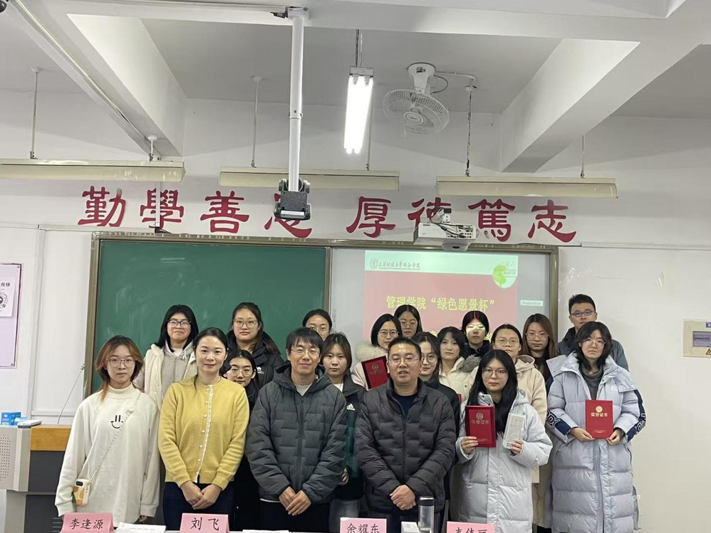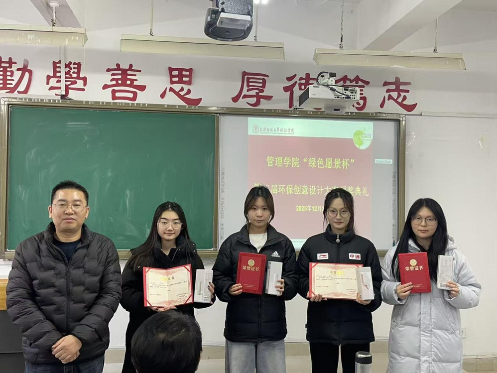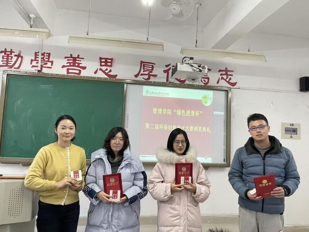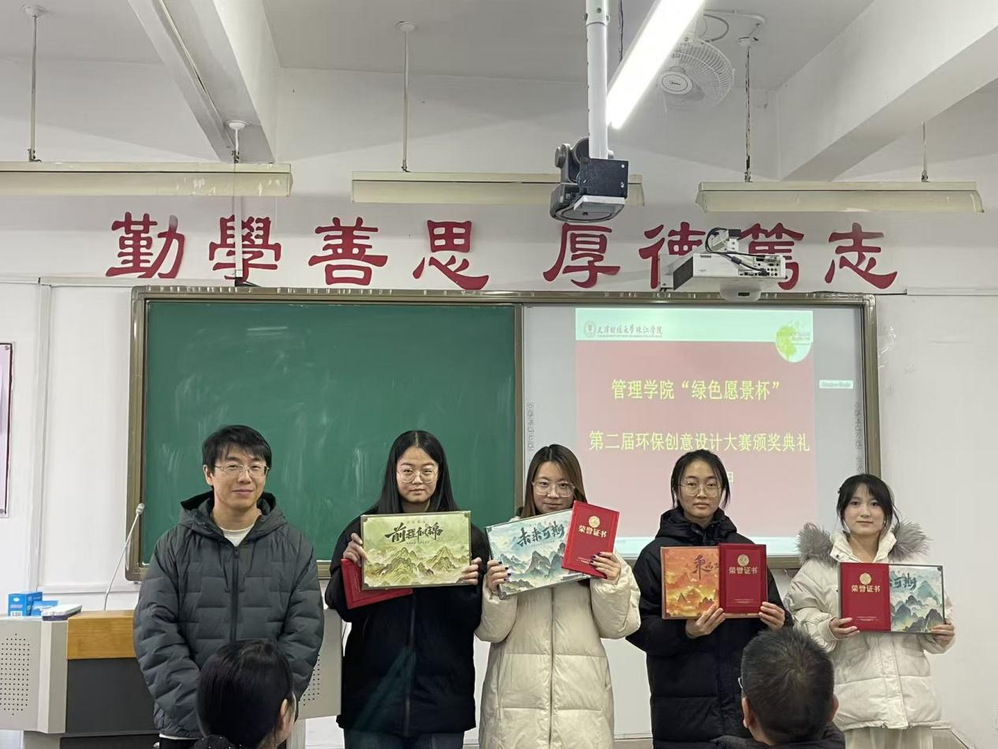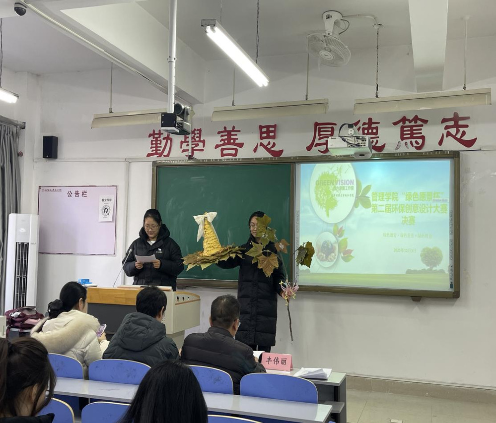 2025年12月3日,管理学院绿色愿景工作室在日新109教室成功举办“绿色愿景杯”第二届环保创意设计大赛决赛及颁奖仪式。管理学院管理系副主任余耀东老师、旅游与酒店管理系副主任刘飞老师,艺术学院艺术设计系视觉传达设计专业丰伟丽老师,以及管理学院绿色愿景工作室负责人李逢源老师受邀出席活动,与现场师生共同见证环保创意与实践智慧的碰撞。