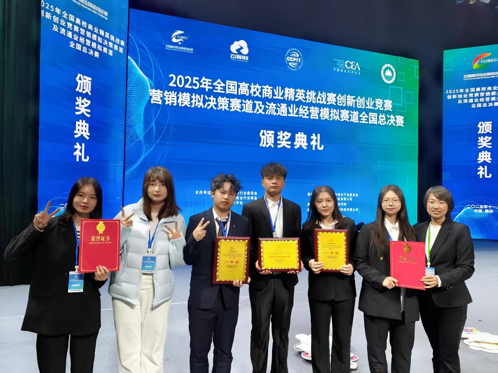 本次竞赛由管理学院组织,参赛学生来自管理学院、会计学院、经济学院。该竞赛本年度3月份启动备赛,一方面,组建了一支经验丰富的专业教师指导团队,涵盖企业管理、人力资源管理、市场营销、大数据分析、经济等多个领域,为学生提供“理论精讲+案例拆解+模拟推演”的系统化培训;另一方面,借助专业创业、营销仿真软件,让学生沉浸式体验从市场调研到策略落地的全流程操作。备赛期间,参赛学子们以专业课程知识为基底,主动对标行业前沿营销趋势,不仅梳理了快消、零售等行业的经典案例,还反复打磨定价模型、优化推广方案,团队的实战能力在高强度训练中持续提升,面对复杂的虚拟市场环境与强劲的对手,学子们冷静分析、高效配合,最终凭借精准的需求捕捉与灵活的策略组合,荣获多项国家级奖项。同时,6名同学组建的精英团队入围线下精英挑战赛,最终荣获精英奖。