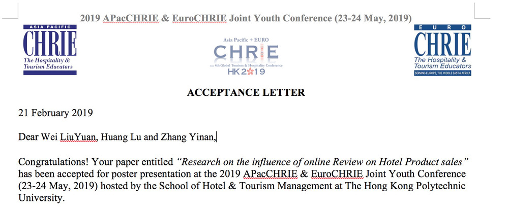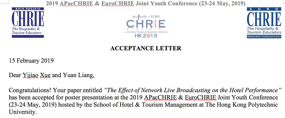 学术方面,IHMS工作室成员黄璐和韦柳媛以英语论文Research on the impact of online reviews on hotel product sales、王蔚晴以英语论文Effects of Film-induced Tourism on Travel Intentions within China、薛以骄以英语论文The Effect of Network Live Broadcasting on the Hotel Performance被2019年亚太酒店餐饮及学术教育委员会和欧洲酒店餐饮及学术教育委员会APacCHRIE&EuroCHRIE联合青年大会所接收并受邀参加联合青年大会并进行全英文学术演讲。
