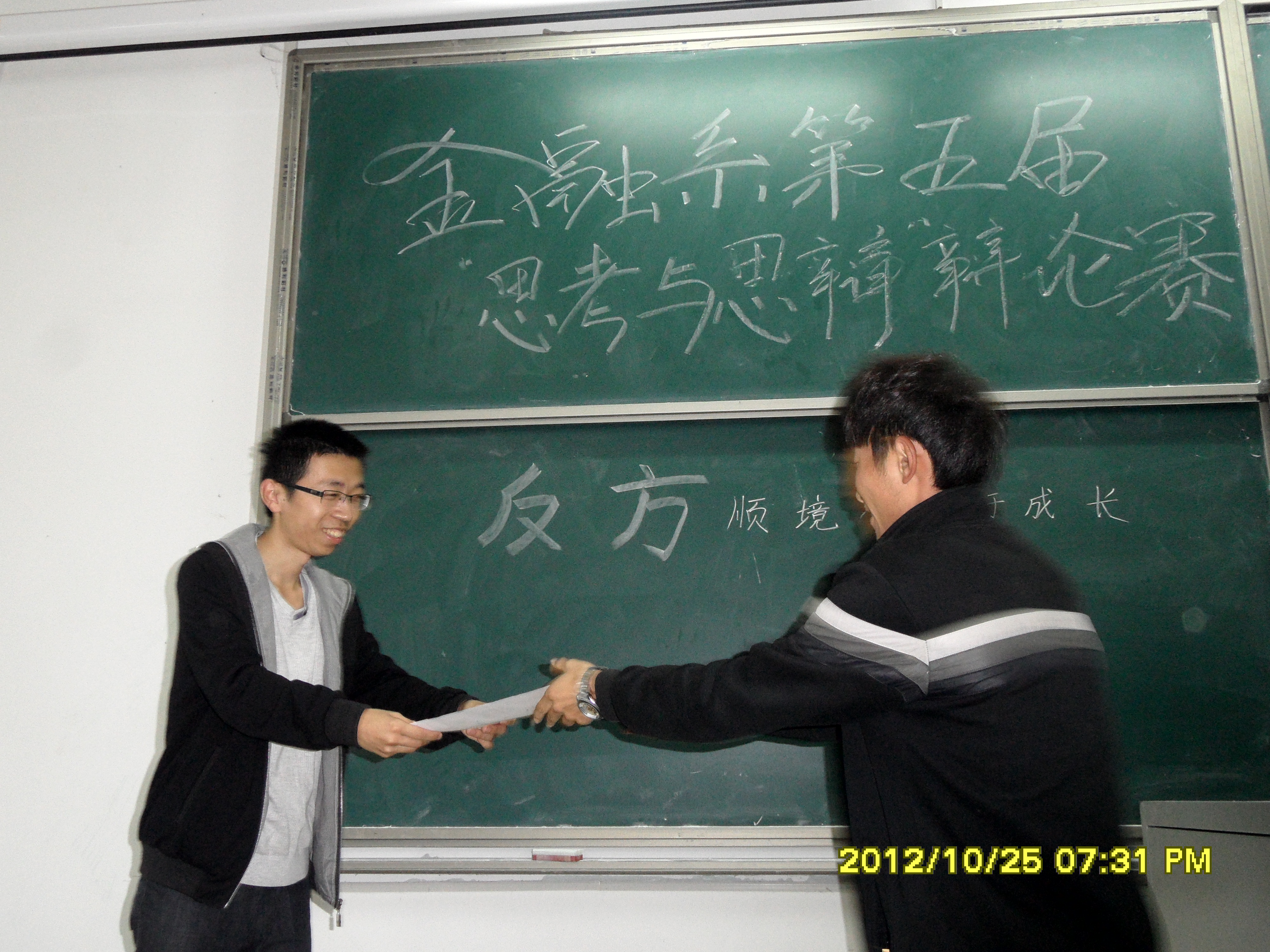 2012年10月25日金融系第五届思辨辩论赛于日益116教室举行。金融系辅导员谭超老师亲临现场观看。今晚第一场比赛的队伍为正方:国金1219班,反方:国金1218班。两支队伍分别就“网络使人亲近还是疏远”展开辩论,双方争辩手不时提出独到观点,让现场的观众都不禁眼前一亮。参加第二场辩论赛的队伍为正方:保险1204班,反方:金融1212班,两支队伍就“逆境还是顺境有利于成长”展开精彩辩论。双方辩手唇枪舌剑,你来我往,纷纷就该辩题提出自己的观点。特别值得一提的是王沛杰学长的精彩辩论让观众们不由自主地鼓掌,并将现场的气氛推向了高潮!两场比赛结束后,由主持人邀请谭超老师对此次比赛进行点评,并为分获本次比赛前三名的金融1211班,金融1212班,金融1210班的班级代表颁发了荣誉奖状。同时此次比赛还评选出了六位表现出众的最佳辩手。辩论赛就此圆满结束了,让我们期待下一场智慧与才思的交锋,激情与勇气的碰撞!(学生记者 顾维佳 国际金融1220班)
