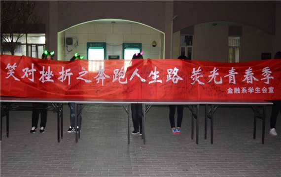 为贯彻“笑对挫折”系列活动,展现金融系学子的勇敢坚强精神,金融系学子在学生会的带领下于3月21日晚开展了“奔跑吧,金融!”夜跑大赛。下午六点三十分,近三百名学生自发到达体育场集合,并在领取了荧光棒等装备。