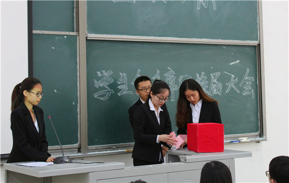 参加本次换届选举的候选人共有七位,分别是体育部部长吴晗,信息部部长王晓雨,学习部副部长陈秋宏,文艺部部长洪雪婷,学习部副部长董哲豪,生活部部长董晗,外联部部长郑杰。七候选人根据抽签决定的顺序依次进行竞选演讲,辅导员、15级主席团以及学生会投票代表根据竞选人在演讲中体现出的能力与素养,秉持公平公正公开的原则,对候选人进行投票。七位候选人各有千秋,都在演讲中表现了他们对学生会主席这一职位认知及展望。投票环节后,秘书部进行唱票,并由学生会各部门部长代表进行监票,与此同时15级主席团针对自己过去一年的工作状况分别做了卸职演讲。最终根据票数高低,选举出董晗担任金融系新一届主席,陈秋宏,吴晗,王晓雨,郑杰为副主席。