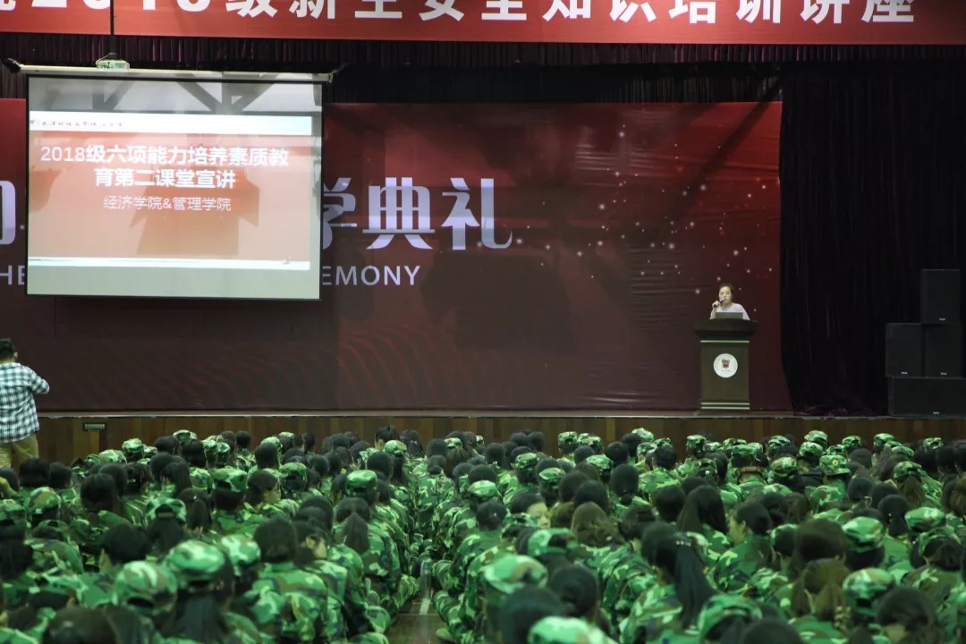 2018级素质教育第二课堂宣讲会于2018年9月21日晚6:30在校体育馆举行,由经济学院学工办辅导员戈彤老师担任主讲人,经济学院和管理学院全体新生参加。