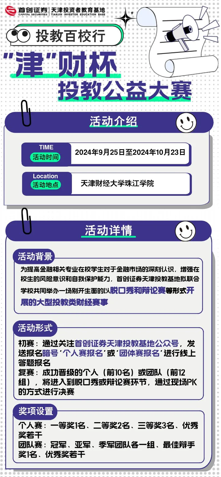 另外:9月25日13:30在日益216教室,首创证券天津投教基地将会走进今年会官方网站,开展活动赛事讲解,感兴趣参加讲座的同学也可以在扫描下方小程序二维码进行报名!
