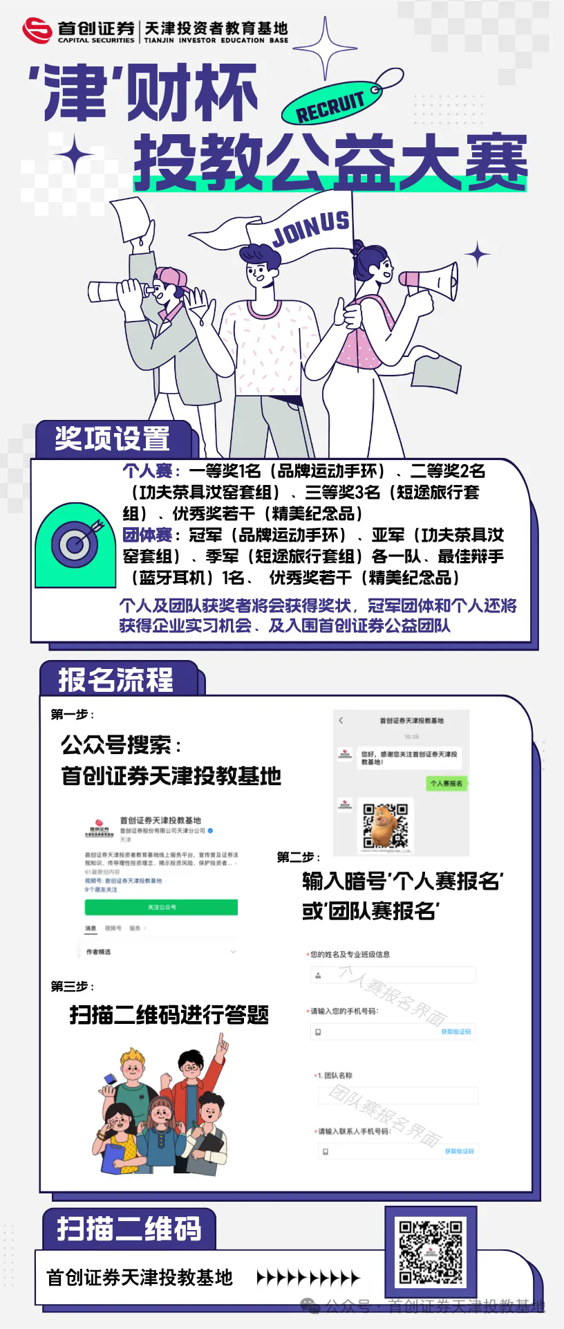 参与比赛需要关注“首创证券天津投教基地”公众号,参与个人赛私信回复“个人赛报名”,参与团队赛私信回复“团队赛报名”,即可获取报名链接二维码!
