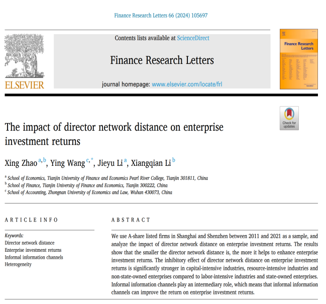经济学院教师赵星博士作为第一作者合作完成的学术论文“The Impact of Director Network Distance on Enterprise Investment Returns” 在经济学领域Top英文期刊Finance Research Letters在线正式发表(https://doi.org/10.1016/j.frl.2024.105697)。该期刊于2004年创刊,是中科院经济类Top期刊,具有很高的学术声誉,Web of Science JCR 分区中位列SSCI一区,当前影响因子IF为7.8。