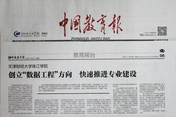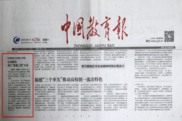 学院“数据工程”专业的建设情况也得到了全国性主流媒体的关注。2015年11月20日,《中国教育报》教育展台版块以《创立“数据工程”方向 快速推进专业建设》为题,对学院“数据工程”专业方向的设置背景、市场需求、人才培养方案等内容进行了详细报道。 2015年11月28日,《中国教育报》第二版又以《启动教改 创立“数据工程”专业》为题,对学院“数据工程”专业的人才培养方案及专业设置等相关情况进行了专门报道。