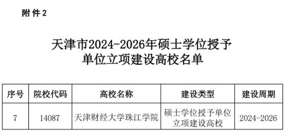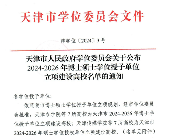 天津市人民政府学位委员会下发了《天津市人民政府学位委员会关于公布2024-2026年博士硕士学位授予单位立项建设高校名单的通知》(津学位[2024]3号),学院成功获批天津市2024-2026年硕士学位授予单位立项建设高校