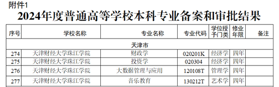 近日,教育部发布《关于公布2024年度普通高等学校本科专业备案和审批结果及<普通高等学校本科专业目录(2025年)>的通知》(教高函〔2025〕3号),学院申报的大数据管理与应用、投资学、财政学和音乐教育四个专业成功通过教育部专业备案和审批,截至目前,学院本科专业总数达到33个。