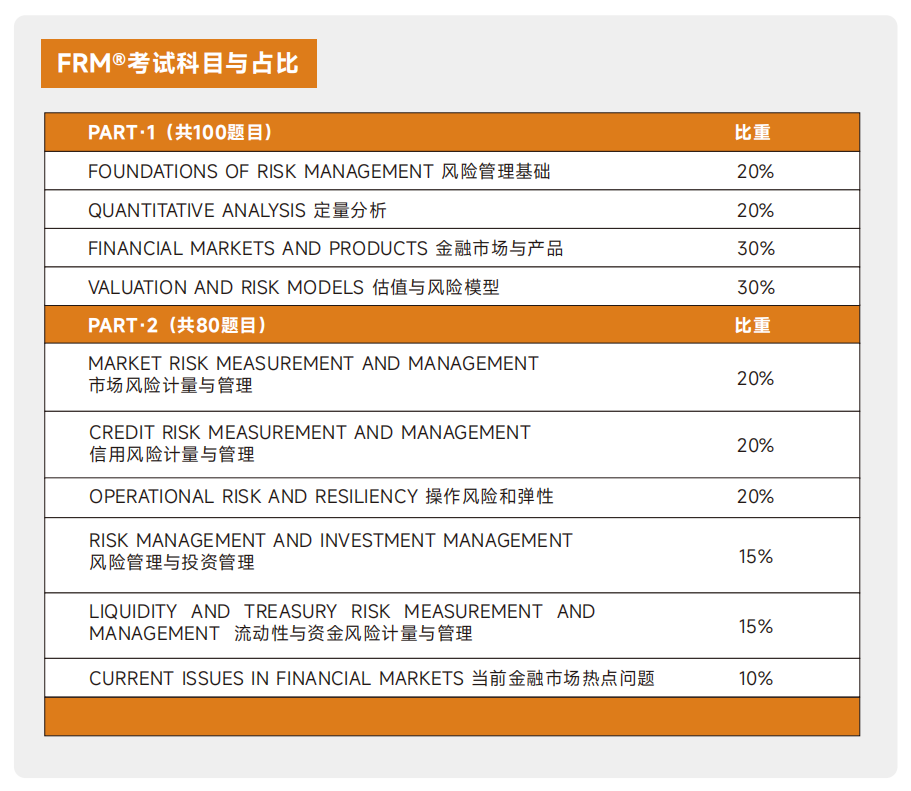 FRM的课程体系是综合性的,以实践为导向,涵盖金融风险管理中的基本工具、技术、基础理论以及金融风险的主要子领域。