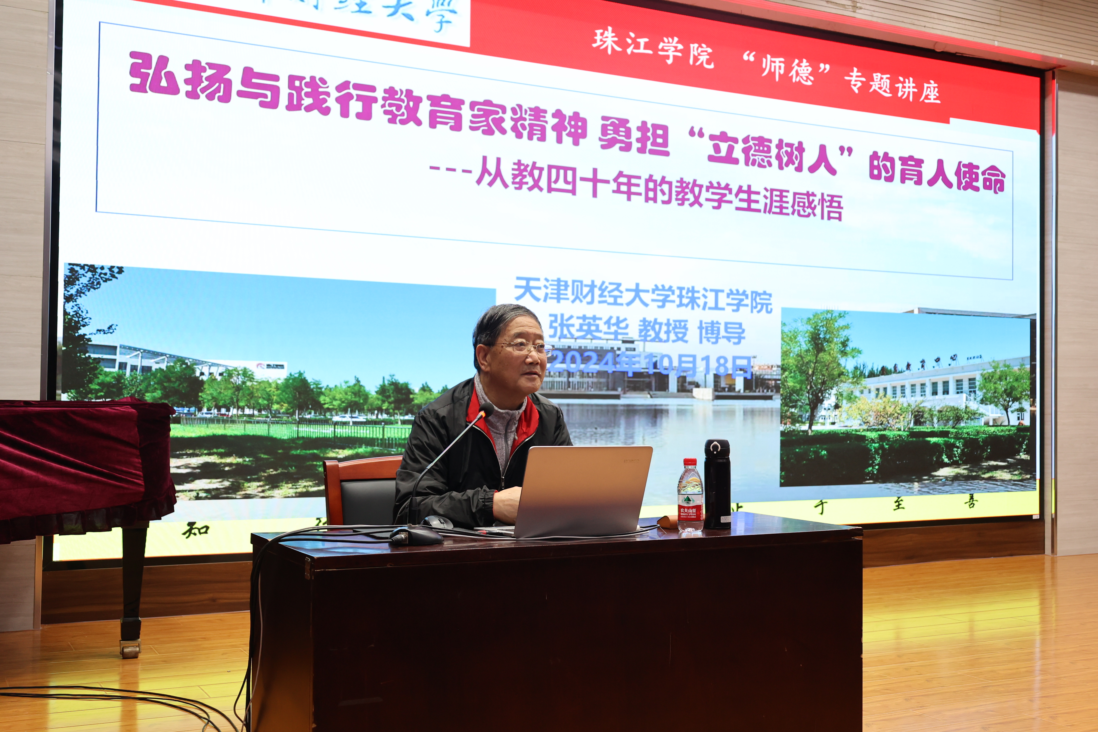 为进一步加强新入职教职工的职业素养与综合能力,切实加强自身思想政治素质和师德师风建设,10月18日下午,学院在弘毅楼报告厅开展2024年新入职教职工作师德师风专题讲座,管理学院院长张英华教授为新入职教职工做题为“弘扬与践行教育家精神 勇担‘立德树人’的育人使命”的师德师风专题讲座,全体新入职教职工参加讲座。