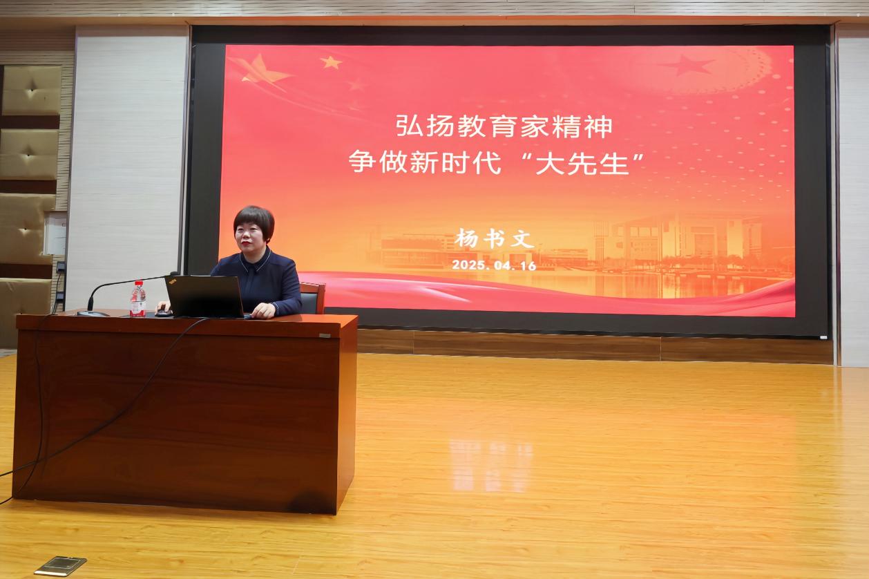 杨教授围绕“为什么要当老师?”“想当怎样的老师?”“将怎样当老师?”这三个核心问题深入浅出地阐述了教育家精神的内涵和新时代教师职业素养。她指出,弘扬教育家精神要从立根、立德、立业、立学、立魂、立志这六个方面下功夫,不断提高自身道德修养,以模范行为影响和带动学生,做学生为学、为事、为人的大先生。