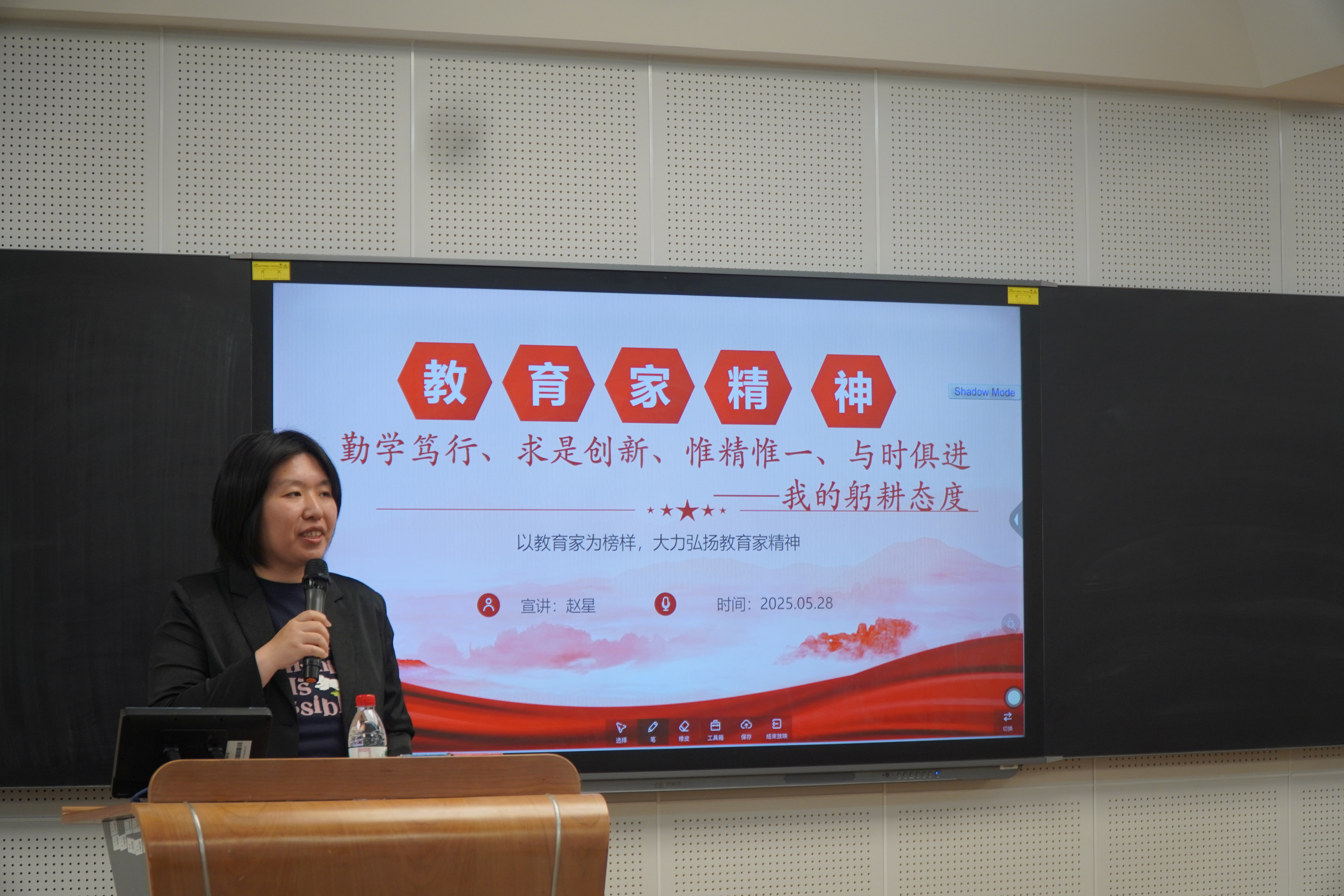 随后,赵星老师以“勤学笃行、求是创新、惟精惟一、与时俱进——我的躬耕态度”为题,结合自身教学实践与理论思考,分享了自己对教育家精神的理解和实践。赵星老师提出,教育家精神体现在教学的每一个细节中,无论是课堂上的启发引导,还是课后对学生的关怀帮助,都需要教师用智慧与热爱投入其中。她强调,教育家精神并非高不可攀的标签,而是每一位普通教师通过日常实践可以践行的职业信仰,教师要将教育家精神内化于心、外化于行,不断提升教育教学水平,为学生成长与社会发展贡献力量。